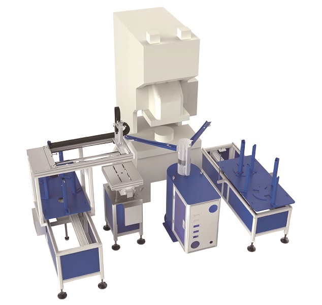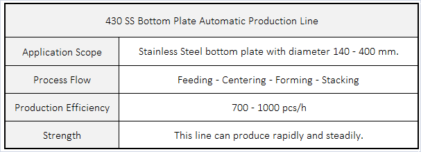 2] The automatic production line for 430 SS cowl plate consists of material feeder, position station with centring mechanism, 2 arms robot and a storage car for finished components. This group of automatic machinery can be used on C-frame mechanical press machines with pneumatic clutch or any hydraulic press with C/H frame design.